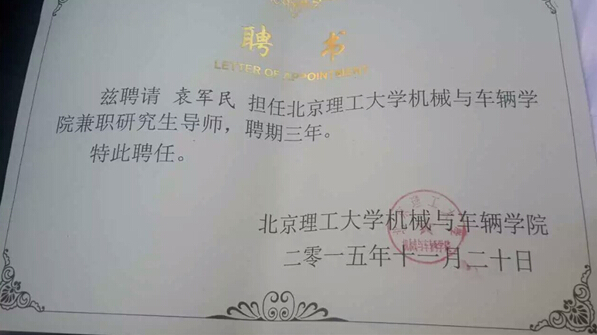 近日,北京理工大學正式下發(fā)聘書,聘請我司袁軍民總經理擔任北京理工大學機械與車輛學院兼職研究生導師,聘期三年。