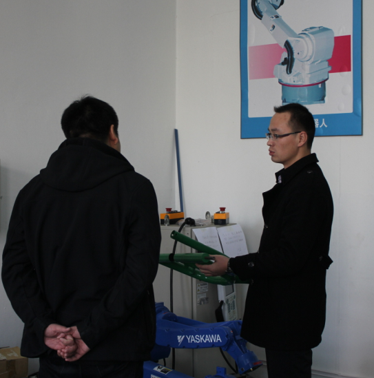 王總向記者介紹機(jī)器人加工的焊接件樣品